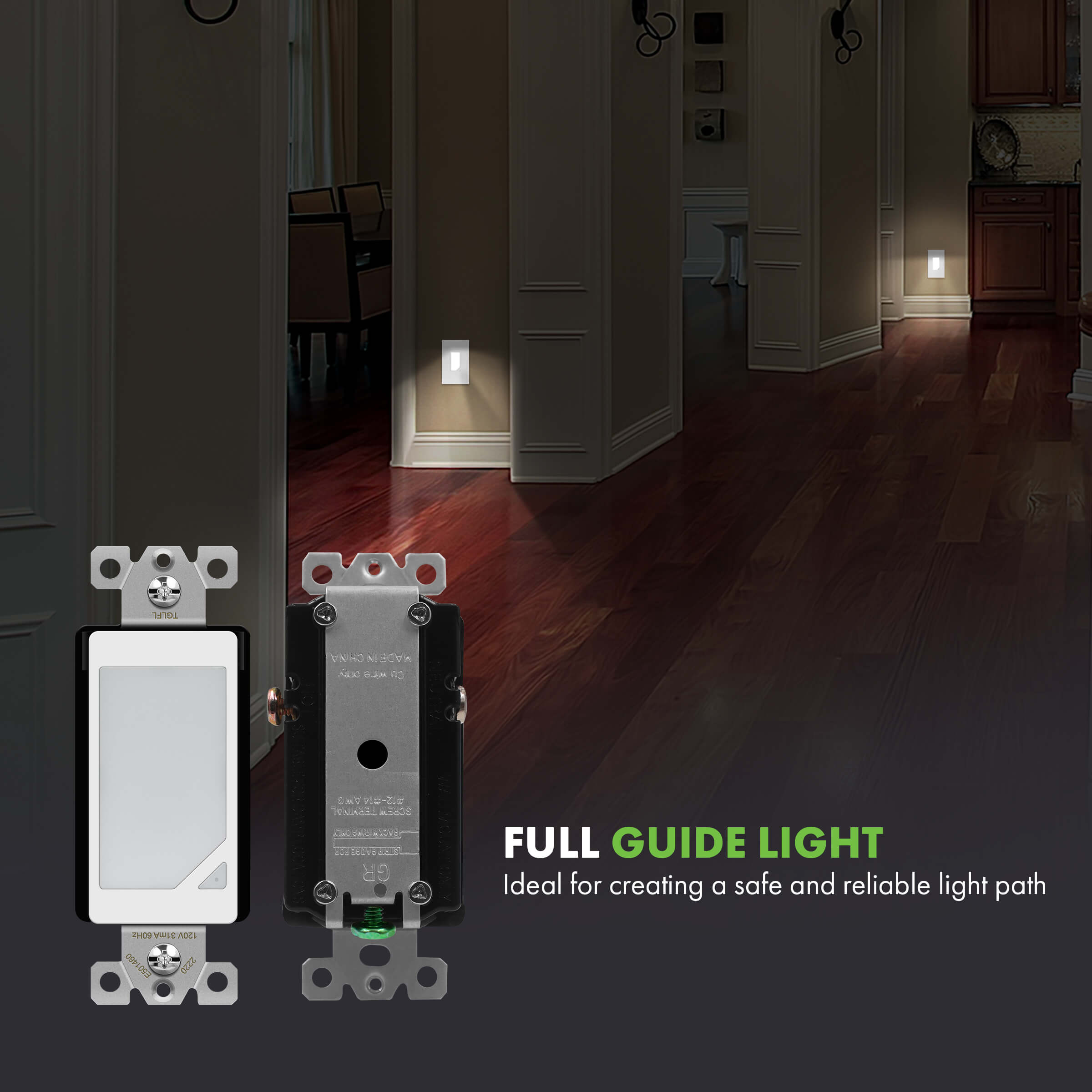 Guide lights are a helpful addition to children’s bedrooms and nurseries, providing a dim night light that is comforting without being too bright. This guide light device is made from unbreakable Polycarbonate Thermoplastic material and features a crisp white color. This product is UL listed and includes a one-year warranty.